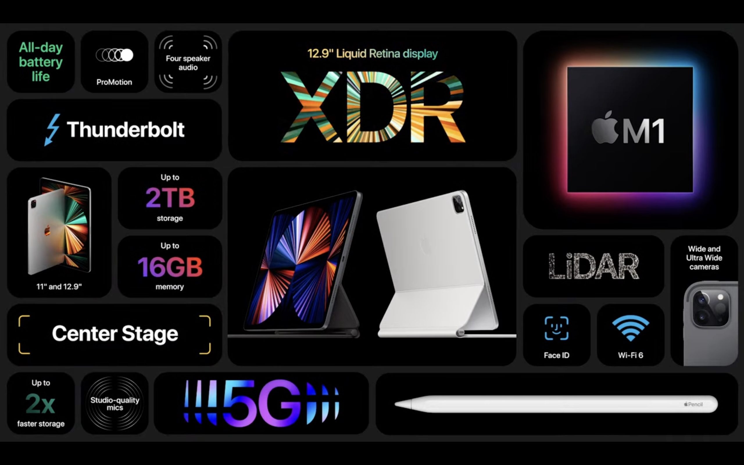 iPad Pro 2021 ใช้ชิป M1 แบบเดียวกับ Mac, CPU แบบ 8-cores เร็วกว่า A12Z ถึง 50%, ใช้ GPU แบบ 8-cores เร็วขึ้น 40%, RAM สูงสุด 16GB
