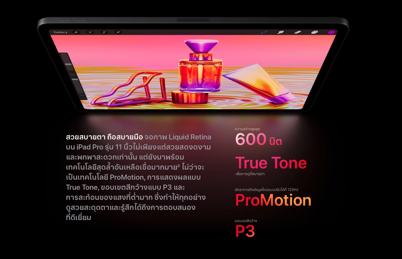 ในรุ่น 12.9 นิ้วใช้หน้าจอ Liquid Retina XDR อัตราส่วนคอนทราสต์ 1,000,000:1, สว่างเต็มหน้าจอ 1,000 นิต , ProMotion 120Hz