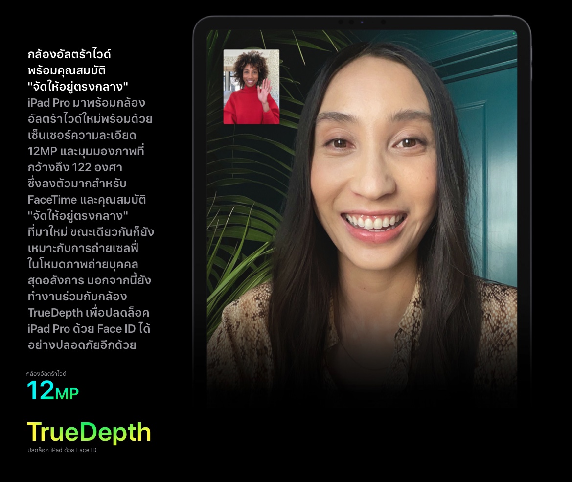 กล้องหน้า TrueDepth, Ultra-wide 12MP มุมมองภาพที่กว้างถึง 122 องศา, มีฟีเจอร์ “จัดให้อยู่ตรงกลาง” (Center Stage) แพนกล้องตามผู้ใช้