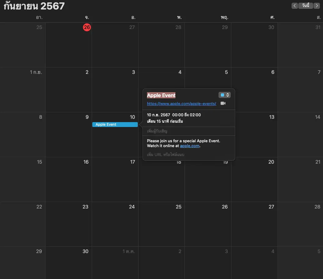 Apple ประกาศจัดงาน Apple Event “It’s Glowtime.” จัดขึ้นวันที่ 9 ก.ย. 2024 หรือ วันที่ 10 ก.ย. 2024 เวลา 00.00 น. ประเทศไทย (คืนวันที่ 9 ก.ย. 2024 ย่างเข้าเช้าวันที่ 10 ก.ย. 2024 ประเทศไทย)