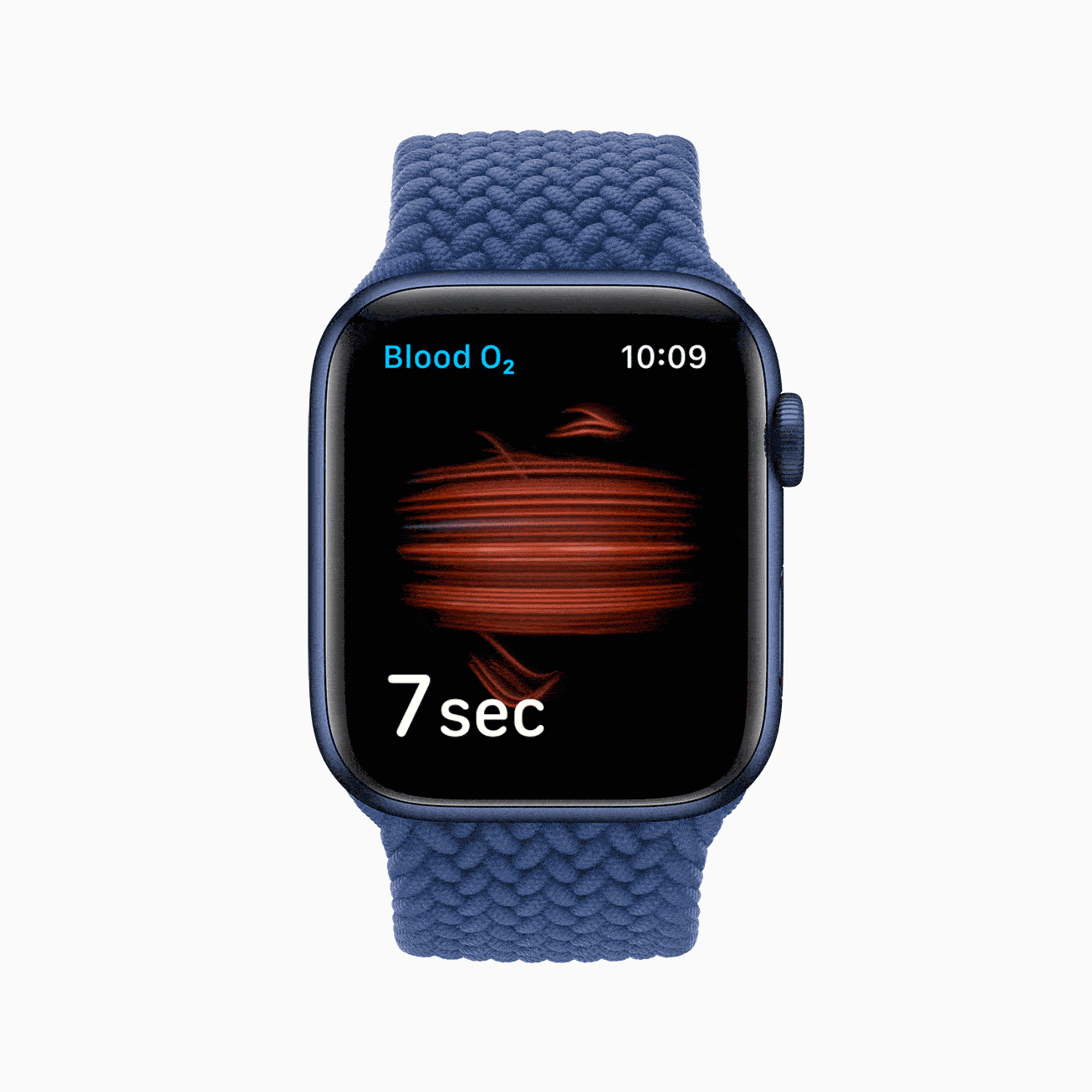 Apple Watch Series 6 ขยายขีดความสามารถด้านสุขภาพจาก Apple Watch รุ่นก่อนหน้า โดยมาพร้อมคุณสมบัติที่สามารถวัดความอิ่มตัวของออกซิเจนในเลือดของผู้ใช้ได้โดยสะดวก ผู้ใช้จึงเข้าใจข้อมูลสุขภาพและฟิตเนสโดยรวมของตนได้ดียิ่งขึ้น ความอิ่มตัวของออกซิเจนหรือ SpO2 หมายถึงเปอร์เซ็นต์ของออกซิเจนที่เซลล์เม็ดเลือดนำจากปอดไปยังส่วนที่เหลือของร่างกาย ซึ่งเป็นการบ่งบอกว่าออกซิเจนในกระแสเลือดได้รับการส่งผ่านไปทั่วร่างกายได้ดีเพียงใด