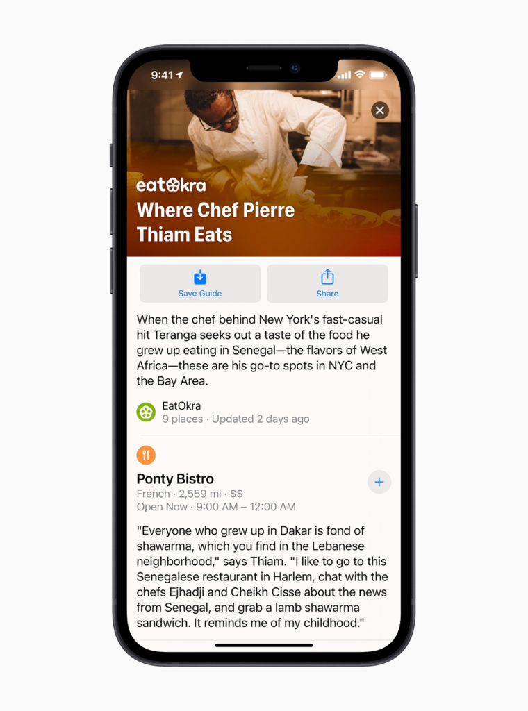 Apple Maps นำเสนอ Apple Maps Guide ที่สร้างร่วมกับ EatOkra เป็นไดเรกทอรี่ธุรกิจที่มีเจ้าของเป็นคนผิวสี ตั้งอยู่ใน Brooklyn