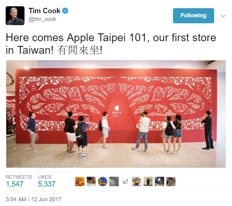 Apple ขยายการบริการลูกค้ามาฝั่งเอเชียมากขึ้นเมื่อล่าสุด Apple ประกาศข้อมูลผ่านเว็บไซต์ Apple.com/tw ว่าจะมีการเปิด Apple Store ที่ตึก Taipei 101 (ตึกระฟ้าอันดับ 4 ของโลก) สาขาแรกในไต้หวัน และ Tim Cook ก็ได้โพสต์ข้อมูลประเด็นนี้ใน Twitter เช่นกัน