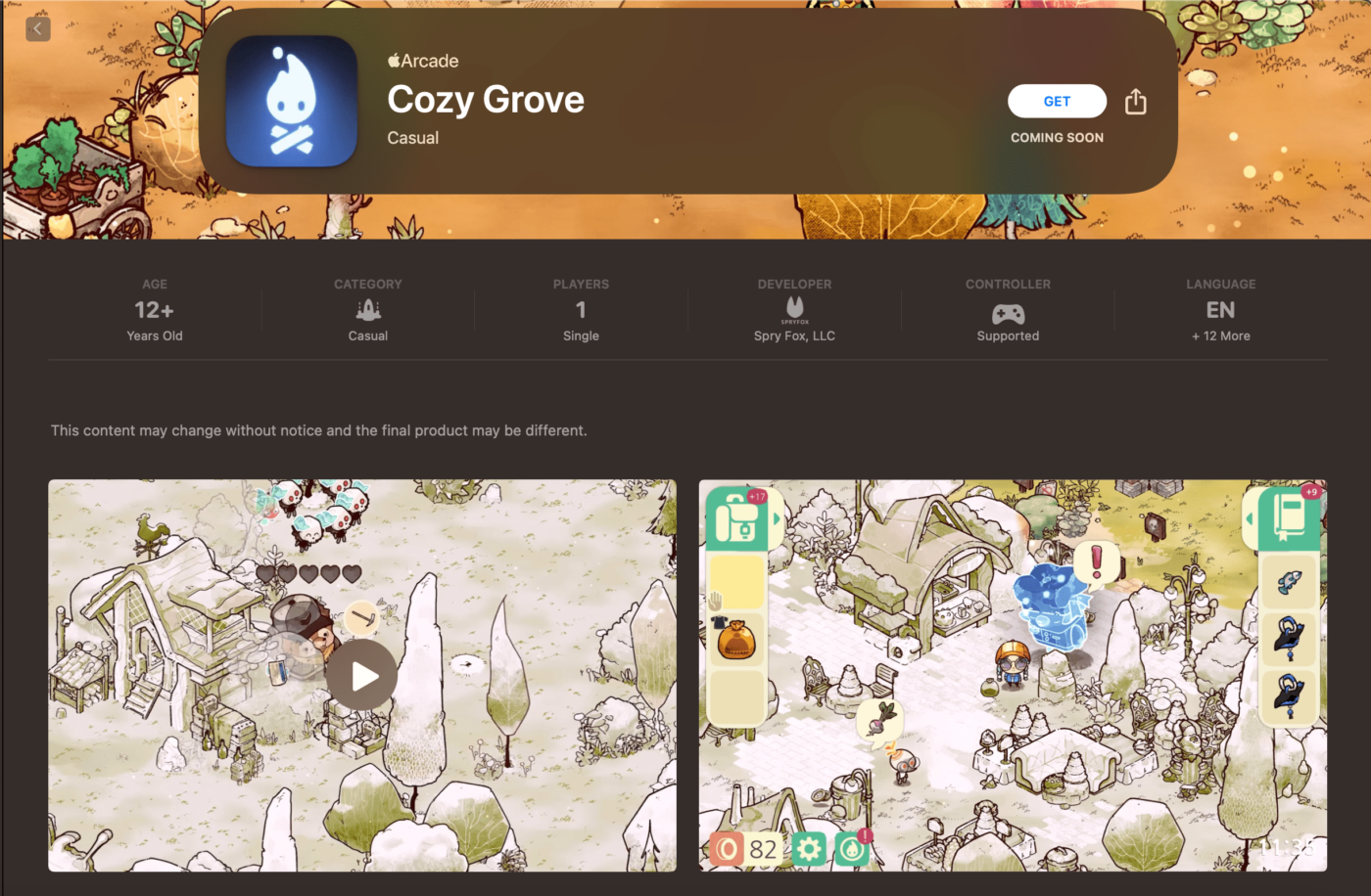 และในเร็ว ๆ นี้ยังจะได้พบกับ Cozy Grove จาก Spry Fox ซึ่งเป็นอีกหนึ่งเกมที่เราตั้งตารอ เพราะนี่คือเกมแนวจำลองสถานการณ์ที่จะพาคุณไปสัมผัสประสบการณ์การตั้งแคมป์บนเกาะผีสิงที่เปลี่ยนแปลงอยู่ตลอดเวลา ท่ามกลางภูมิประเทศที่วาดด้วยมืออย่างสวยงาม ซึ่งจะโลดแล่นอย่างมีชีวิตชีวาเมื่อผู้เล่นได้ช่วยวิญญาณหิวโหย ดูรายละเอียดเพิ่มเติมได้ในส่วน “เจอกันเร็ว ๆ นี้” ในแถบ Apple Arcade