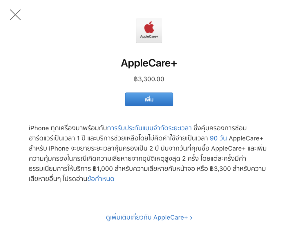 หรือจะซื้อ Apple Care+ แยกต่างหากภายหลังก็ได้ แต่ต้องซื้อภายใน 60 วันนับจากวันที่ซื้อ iPhone