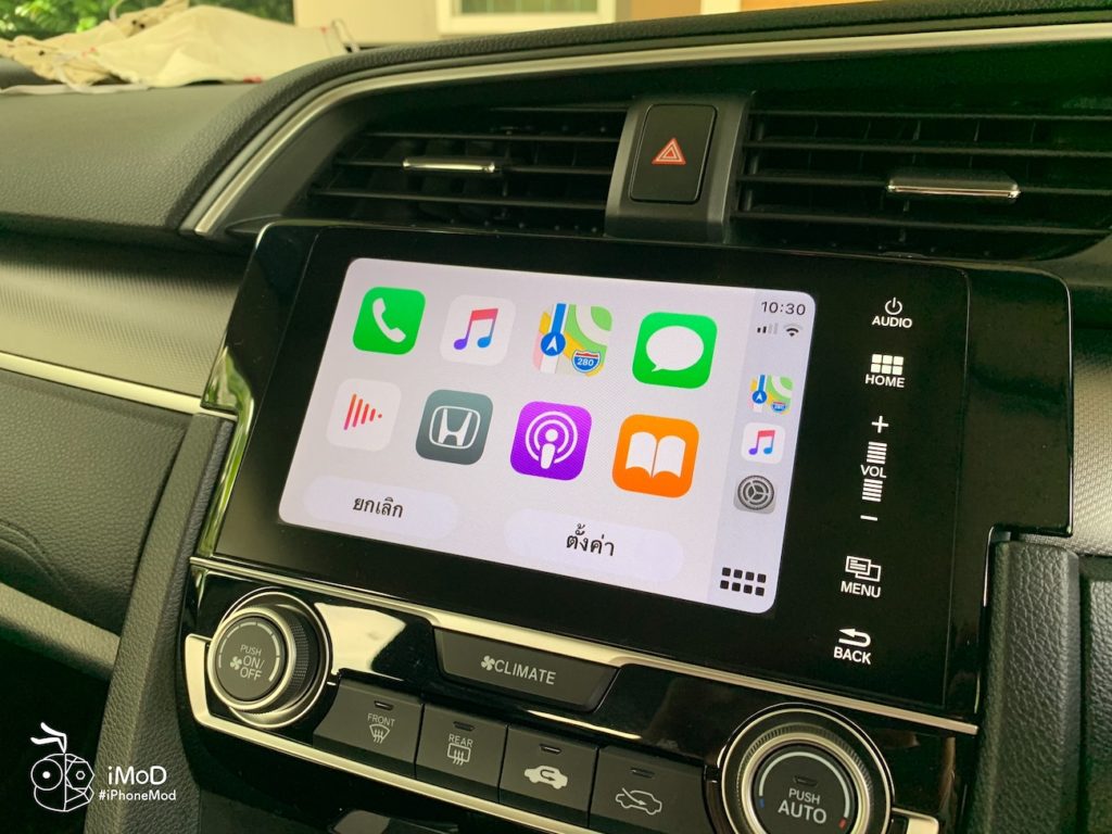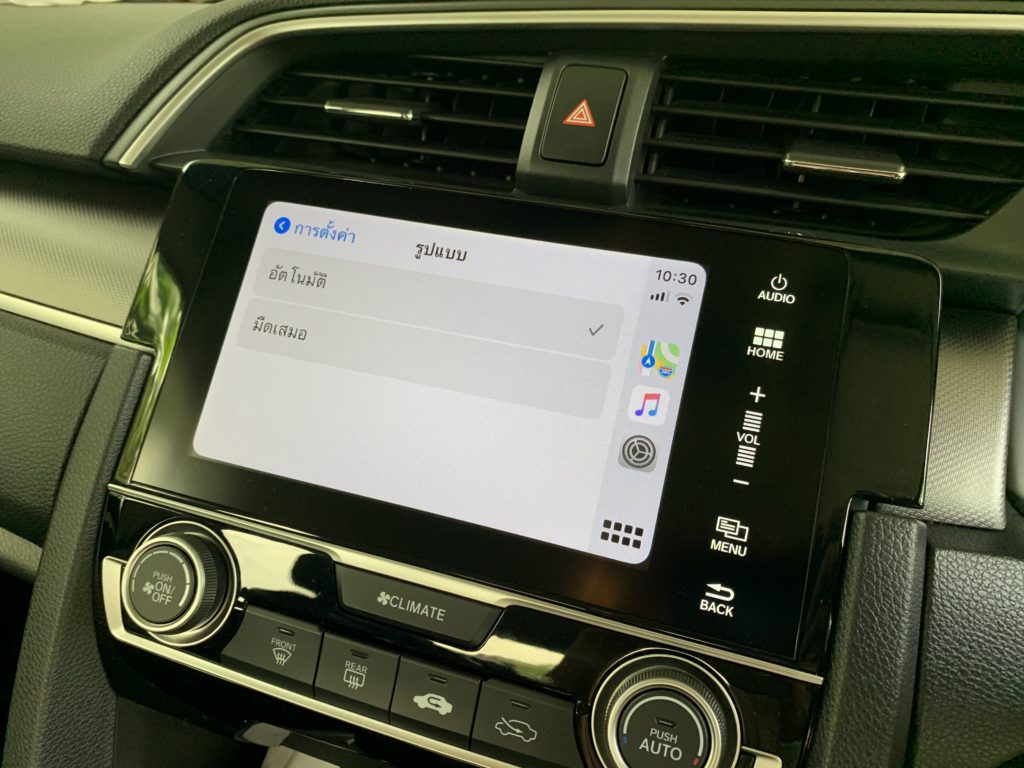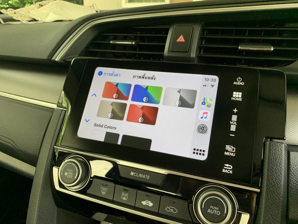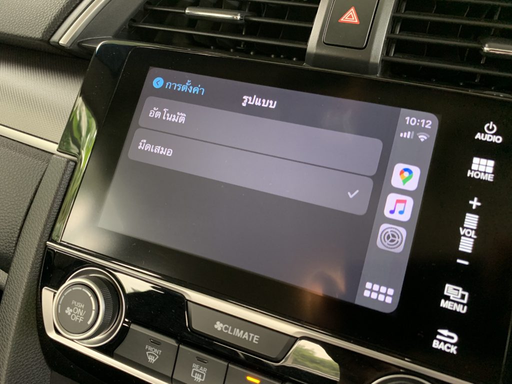 หากเราตั้งค่ารูปแบบการแสดงผลเป็นมืดเสมอ พื้นหลัง (Wallpaper) ของ Apple CarPlay ใน iOS 14 ก็จะแสดงเป็นสีโทนมืด ดังนี้