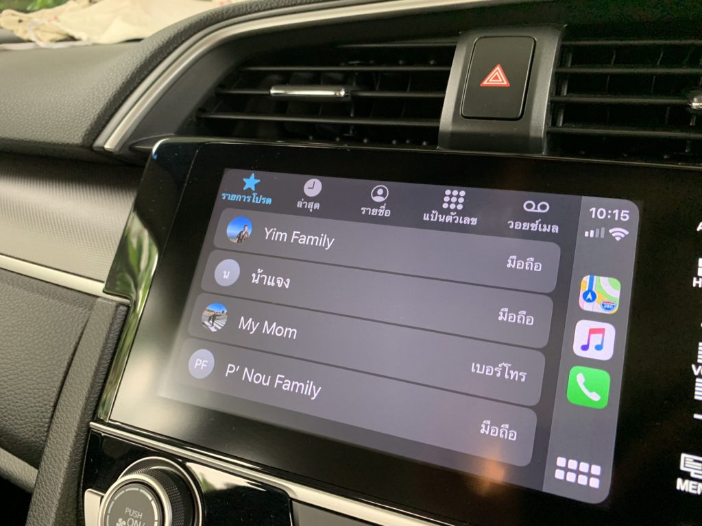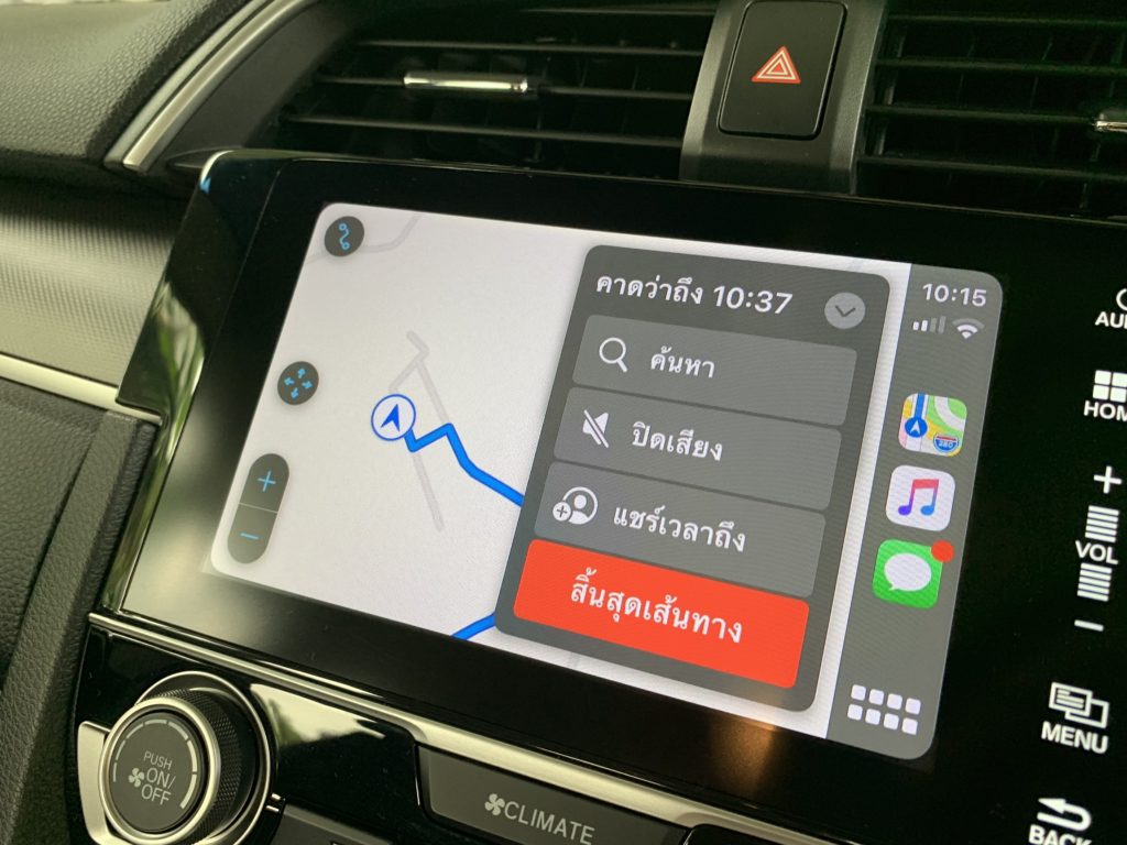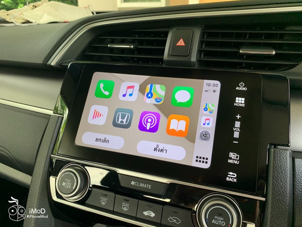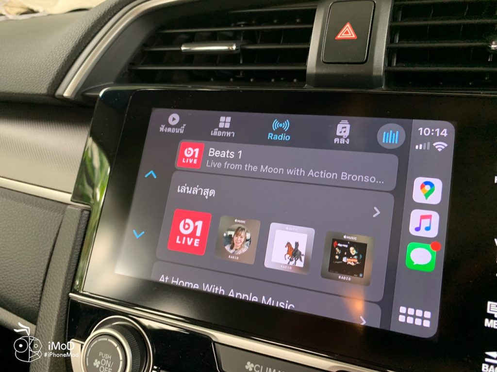 หากเราตั้งค่ารูปแบบการแสดงผลเป็นมืดเสมอ พื้นหลัง (Wallpaper) ของ Apple CarPlay ใน iOS 14 ก็จะแสดงเป็นสีโทนมืด ดังนี้