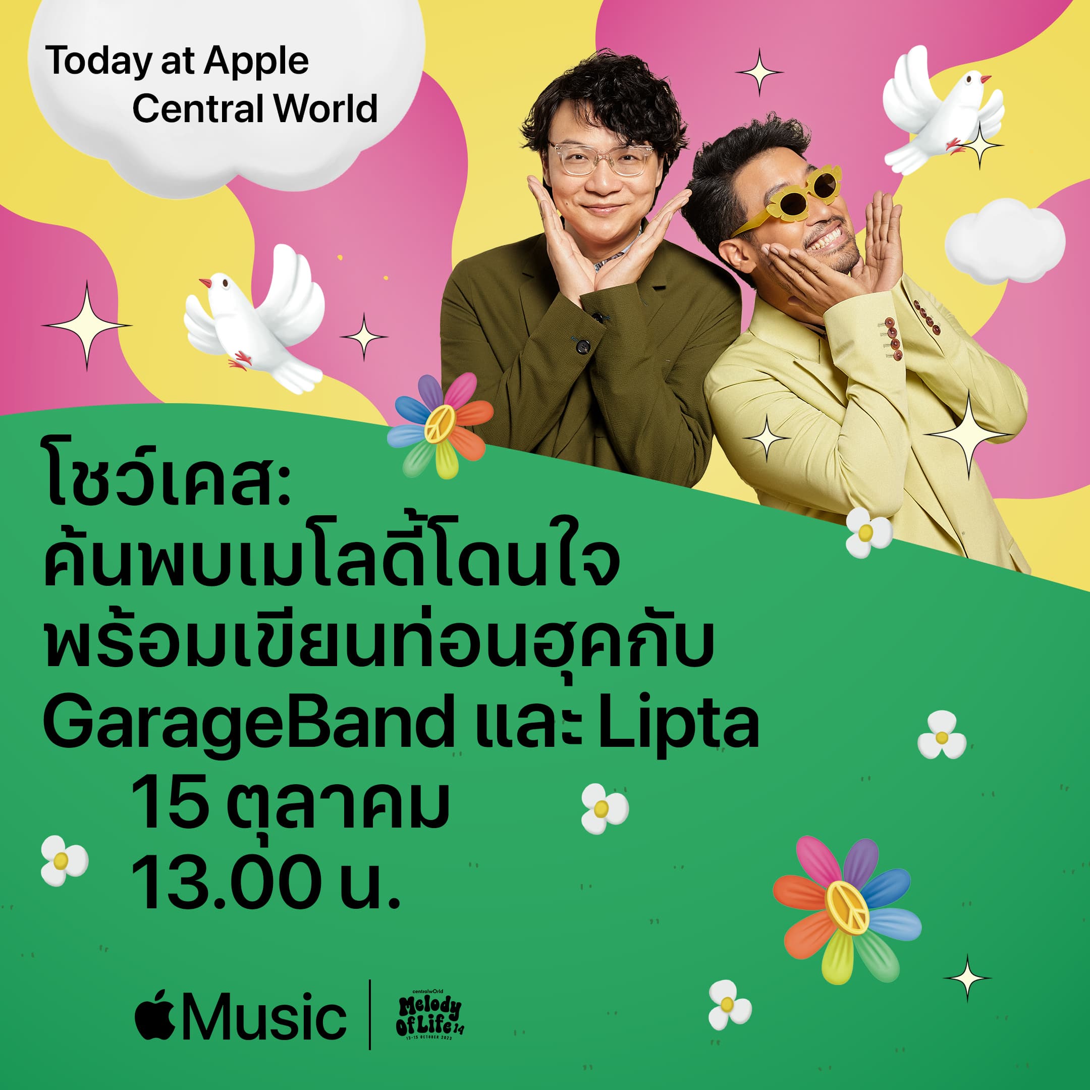 3 ตุลาคม 2023 – Apple Central World และ Apple Music ร่วมฉลองการกลับมาของ Melody of Life เทศกาลดนตรีกลางกรุงสุดยิ่งใหญ่ เชิญเหล่าศิลปินมาแบ่งปันประสบการณ์ทางดนตรีในกิจกรรม Today at Apple ซีรีส์ Melody of Life ชวนทุกคนมาเรียนรู้การสร้างสรรค์เพลงบน iPhone และ iPad ด้วยแอป GarageBand และ Smart Piano