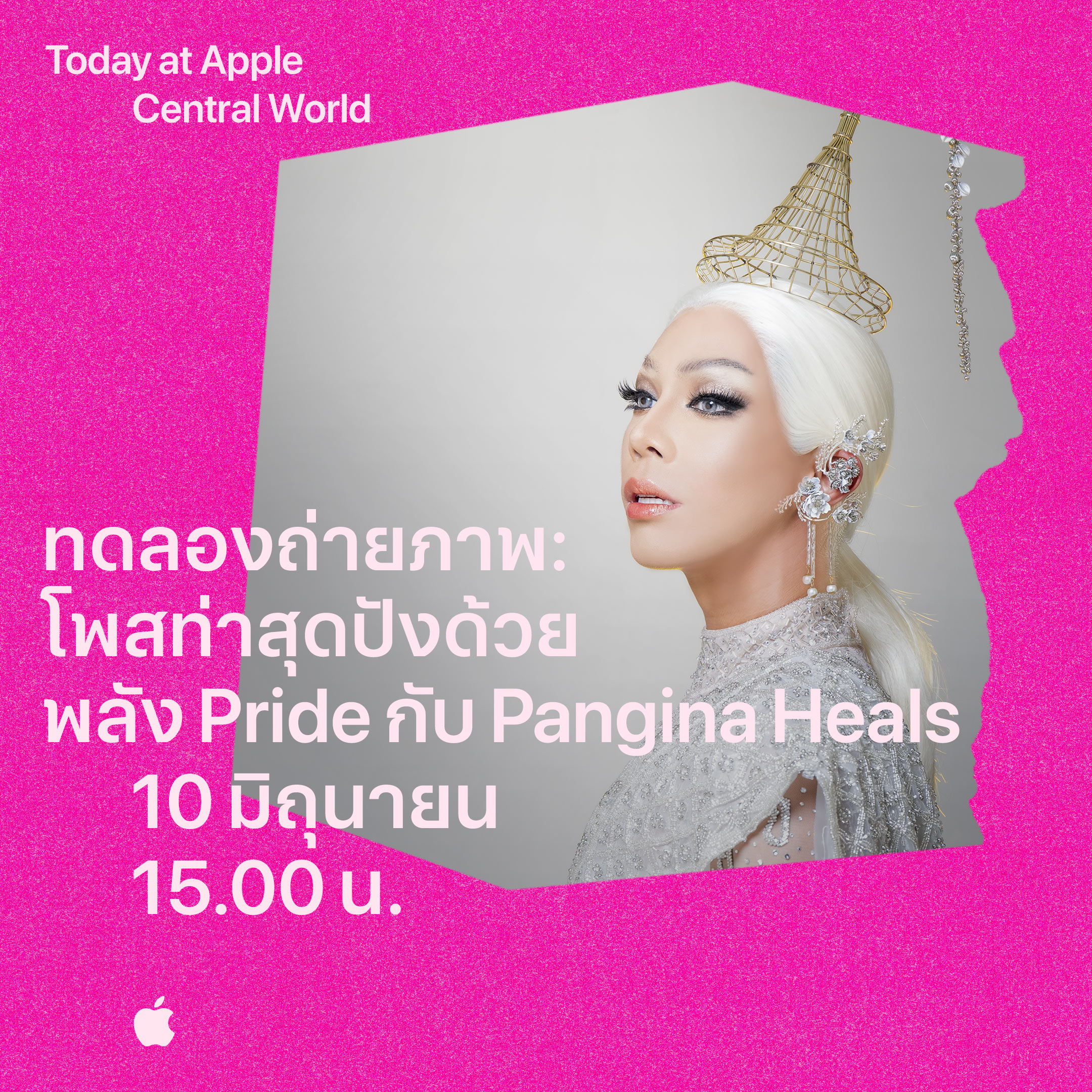 26 พฤษภาคม 2023 – Apple Central World ชวนทุกคนมาร่วมเฉลิมฉลองความหลากหลายในเดือนแห่ง Pride พร้อมปลุกความมั่นใจผ่านการโพสต์ท่าและสร้างสรรค์ช็อตเฟียซด้วย iPhone กับ Pan Pan Narkprasert หรือ Pangina Heals แดร็กควีนชื่อดังระดับโลก ที่จะมาบอกเล่าเส้นทางสู่การเป็นแดร็ก ผู้สร้างแรงบันดาลใจให้ผู้คนมากมาย