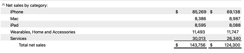 รายได้จาก iPhone ในไตรมาสดังกล่าวอยู่ที่ 85,200 ล้านดอลลาร์ ซึ่งเป็นรายได้สูงสุดเป็นประวัติการณ์ เพิ่มขึ้นจากช่วงเดียวกันของปีก่อนหน้ามากถึง 23%