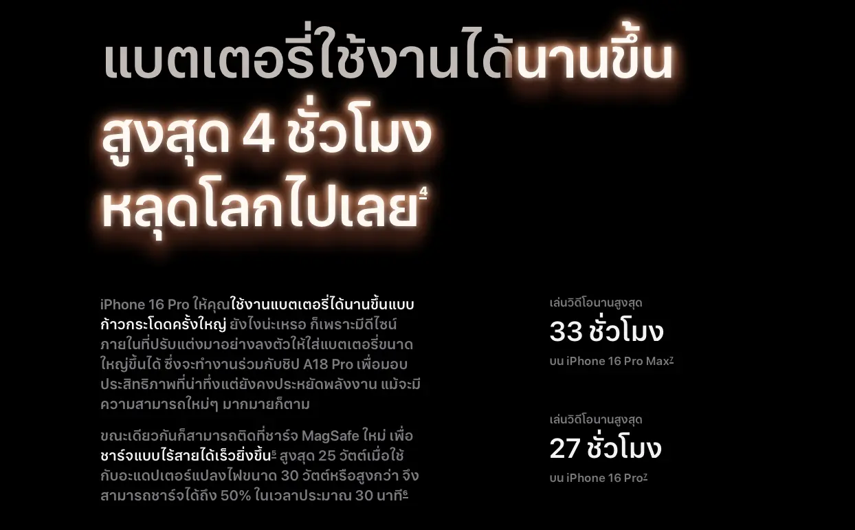Apple เปิดตัว iPhone 16 Pro Max พร้อมระบุว่าเป็นรุ่นที่แบตเตอรี่มีเวลาใช้งานมากที่สุดในบรรดา iPhone, ใช้ดูวิดีโอต่อเนื่องได้ 33 ชม.