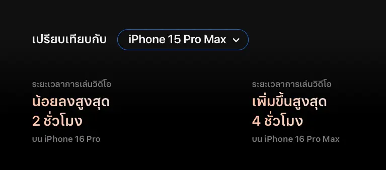 เมื่อเทียบกับ iPhone 15 Pro Max พบว่า iPhone 16 Pro Max มีระยะเวลาแบตเตอรี่ในการดูวิดีโอนานกว่า 4 ชม. (iPhone 15 Pro Max ทำได้ 29 ชม. ตามสเปค) หากตีเป็นตัวเลขก็เท่ากับว่า iPhone 16 Pro Max มีเวลาใช้แบตดูวิดีโอเพิ่มขึ้นจากตัวท็อปปีก่อนหน้าราว 14%