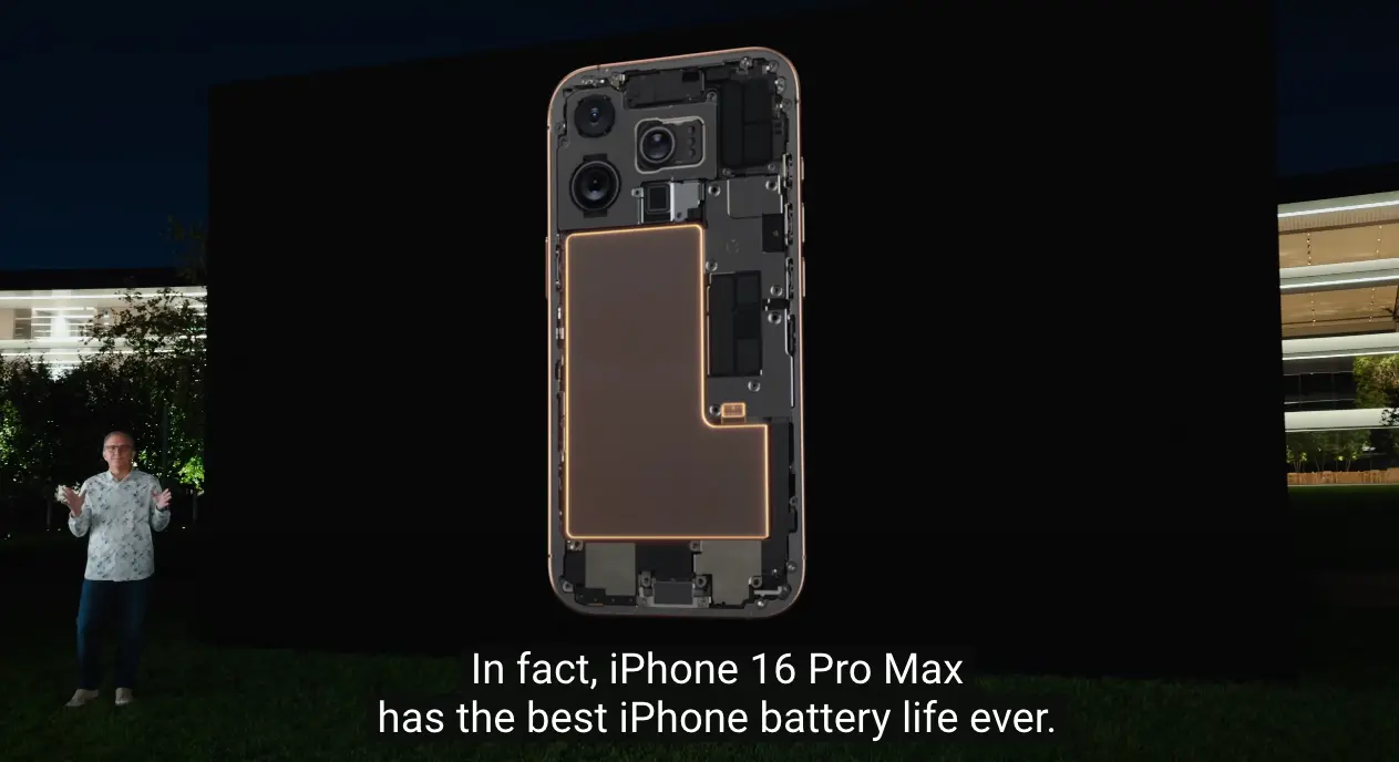 Apple ระบุว่า iPhone 16 Pro Max มาพร้อมแบตเตอรี่ใช้งานได้นานขึ้นแบบก้าวกระโดดครั้งใหญ่ ทั้งการปรับดีไซน์ภายในตัวเครื่องเพื่อให้ขยายขนาดแบตให้ใหญ่ขึ้นได้, ชิป A18 Pro ที่จัดการประสิทธิภาพได้ดีพร้อมประหยัดพลังงานในตัว ทำให้ iPhone 16 Pro Max มีเวลาเล่นวิดีโอนานสุด 33 ชม.