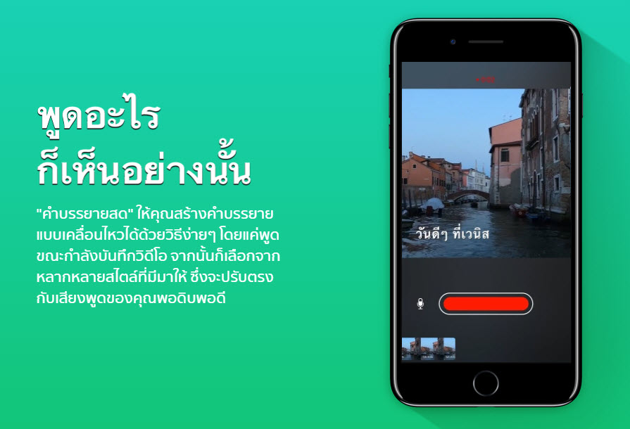 แอปนี้มีความน่าสนใจอีกอย่าง คือ เมื่อเราอัดวิดีโออยู่แล้วพูดระหว่างการอัดวิดีโอ แอป Clips ก็จะสร้างคำบรรยายแบบเคลื่อนไหวจากคำพูด สามารถเลือกสไตล์การแสดงรูปแบบคำพูดได้ รองรับได้ 36 ภาษา