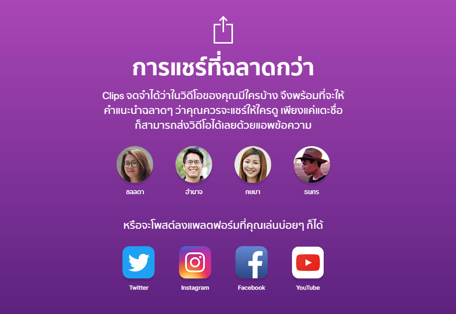 หลังจากอัดวิดีโอและตกแต่งเรียบร้อยแล้วก็สามารถแชร์วิดีโอได้จากแอป Clips ไปยังแอป Social Network ชั้นนำต่างๆได้ เช่น Facebook, Instagram, Twitter และ Youtube