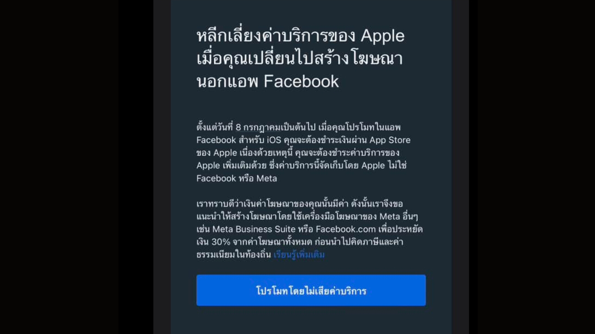 ปรับตัวด่วน! 8 ก.ค 2024 เป็นต้นไป หากยิงแอด Facebook ผ่านอุปกรณ์ Apple และจ่ายเงินผ่านระบบ App Store จะมีค่าธรรมเนียมเพิ่มเติม 30%