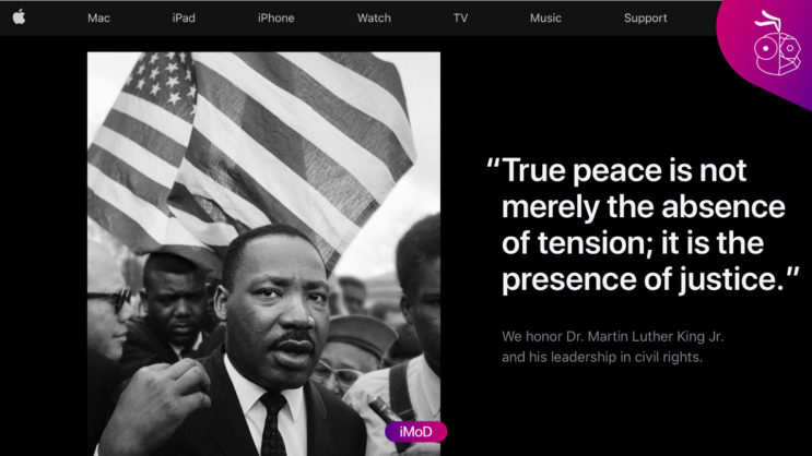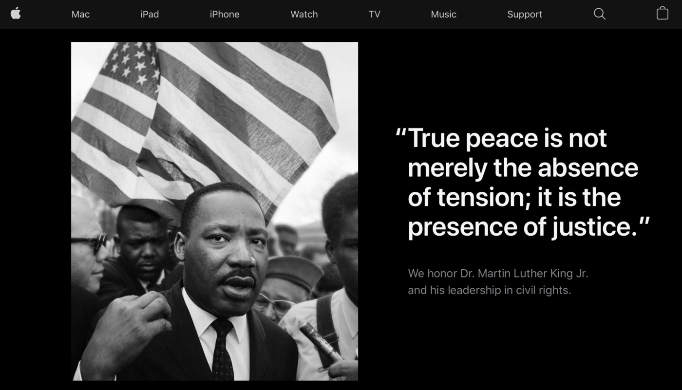 Apple รำลึกถึง ดร. มาร์ตินลูเธอร์คิงจูเนียร์ ด้วยข้อความไว้อาลัยบนหน้าบนเว็บไซต์ โดยมีรูปถ่ายของดร. คิง พร้อมกับวลีเด็กของเขา : “ความสงบสุขที่แท้จริงมิได้เกิดจากการปราศจากความตึงเครียด แต่หากเกิดจากความยุติธรรมของบ้านเมือง”