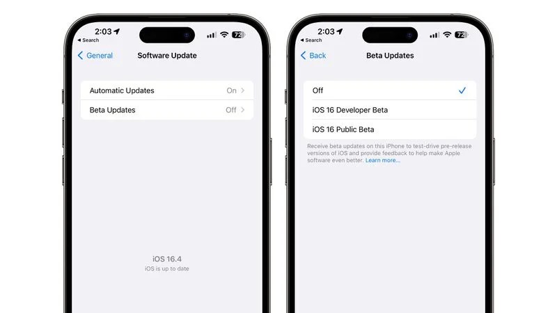 ใน iOS 16.4 Beta นั้นได้มีการเปลี่ยนรูปแบบการอัปเดตซอฟต์แวร์แบบ Beta Updates ใหม่ โดยผู้ใช้ไม่ต้องติดตั้ง Profile ทดสอบ แต่จะมีเมนู Beta Updates ในการตั้งค่า > ทั่วไป > ซอฟต์แวร์อัปเดต แสดงขึ้นมา ทั้ง Public Beta, Developer Beta หาก Apple ID นั้น ๆ ลงทะเบียนทดสอบไว้