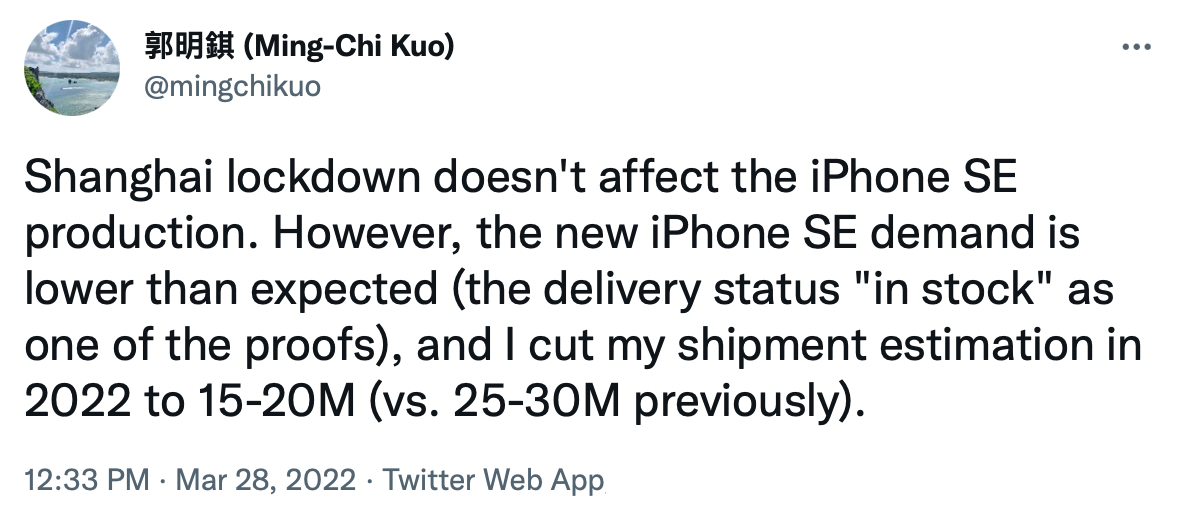 Kuo รายงานว่า การ Lockdown เมือง Shanghai ไม่ได้ส่งผลกระทบต่อการผลิต iPhone SE แต่ยอดความต้องการ iPhone SE 3 ไม่ถึงเป้า ทำให้ Apple ต้องปรับลดกำลังการผลิตลง โดยรายงานระบุว่า iPhone SE 3 ถูกสั่งปรับลดการผลิตไปราว ๆ 2-3 ล้านเครื่อง