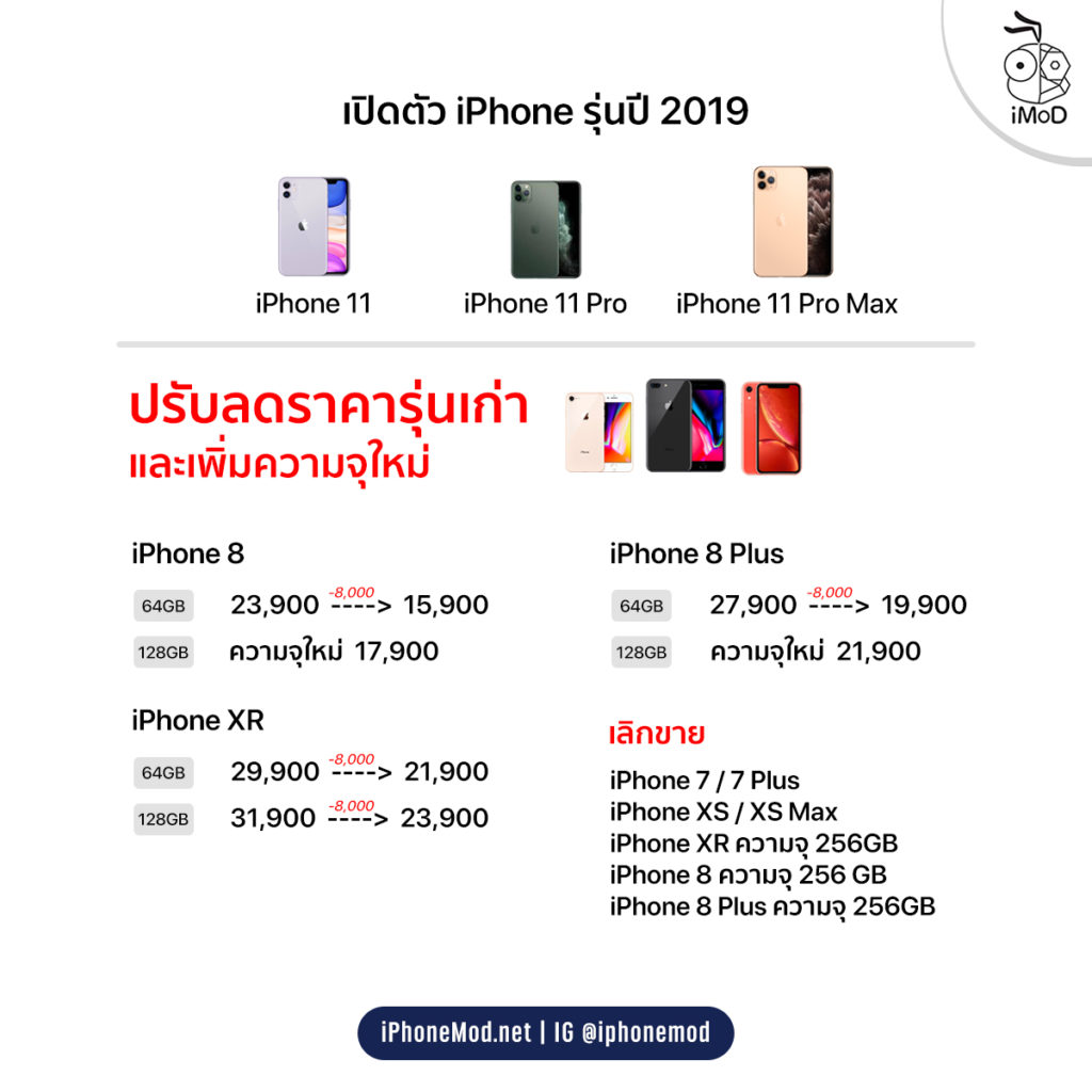 เมื่อปี 2019 ที่ผ่านมา Apple ได้ประกาศเปิดตัว iPhone 11, iPhone 11 Pro และ iPhone 11 Pro Max วันที่ 10 กันยายน 2019 และปรับลดราคา iPhone รุ่นเดิมทันทีและได้เพิ่มความจุใหม่ ได้แก่