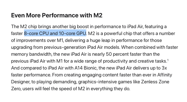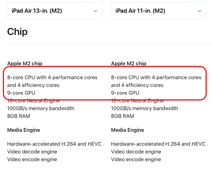 อย่างไรก็ตาม ถือว่าเป็นครั้งแรกที่ Apple ขายสินค้าที่มาพร้อมชิป M2 GPU 9-core เพราะใน MacBook Air ชิป M2 นั้น ใช้ CPU 8-core, GPU 10-core นั่นหมายความว่าชิป M2 ของ iPad Air อาจมีการปรับแต่งสเปคใหม่ จากรุ่น GPU 10-core