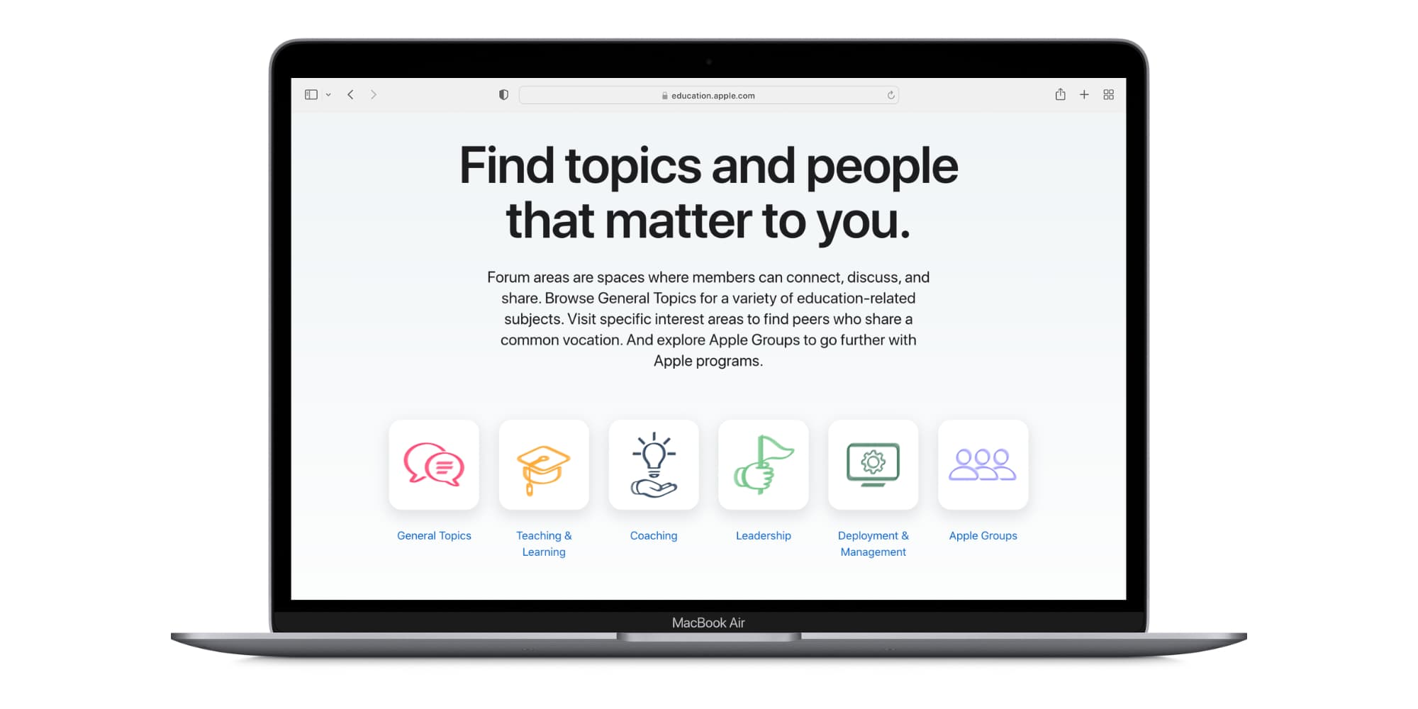 2. Forum พื้นที่เปิดกว้างที่นักการศึกษาจากทั่วโลกสามารถพบปะ พูดคุยและแลกเปลี่ยนเทคนิคการเรียนการสอนที่สร้างสรรค์บนอุปกรณ์ของ Apple ได้ เพื่อเป็นแรงบันดาลใจและช่วยพัฒนาคอมมูนิตี้ของนักการศึกษาทั่วโลกให้แข็งแรงขึ้น