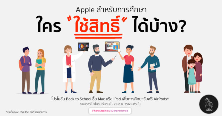 Apple ปล่อยโปรแรงต้อนรับเปิดเทอมกับ โปรโมชัน Back To School 2020 นับว่าเป็นครั้งแรกในประเทศไทยที่ให้ผู้ที่มีสิทธิ์ซื้อ Mac หรือ iPad รุ่นที่ร่วมรายการจากนั้นรับฟรี AirPods 2 รุ่นที่กล่องชาร์จ Lightning นอกจากนี้ยังรับส่วนลด AppleCare+ ได้อีก 20% คำถามต่อมาคือ “ใครสามารถใช้สิทธิ์การซื้อเพื่อการศึกษาได้บ้าง” ทีมงานสรุปให้ดังนี้