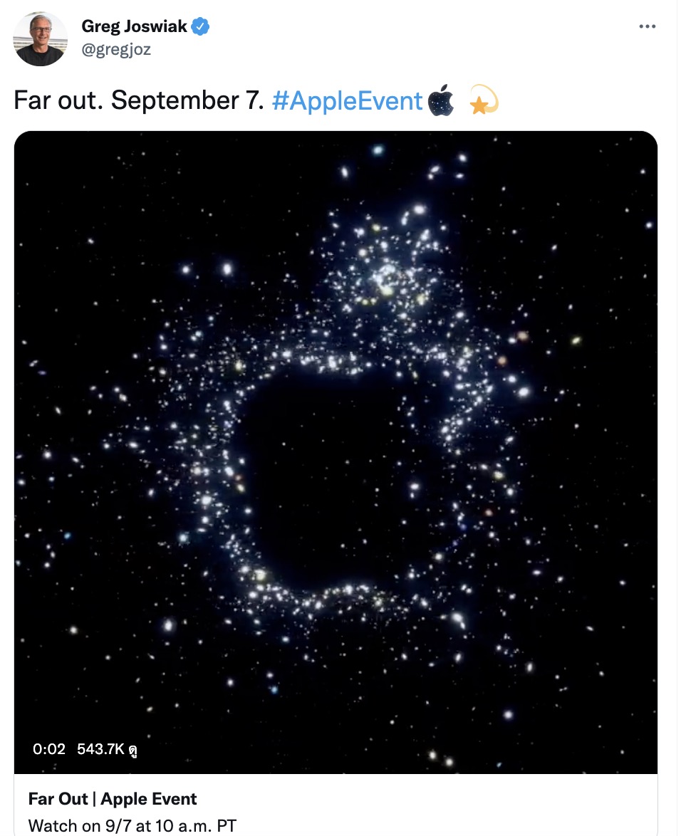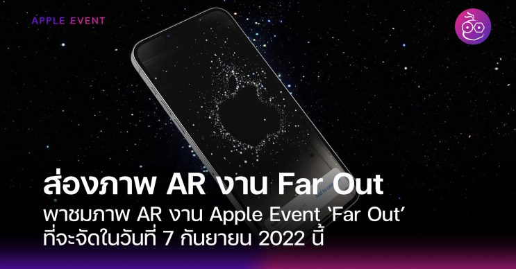 Apple ไประกาศจัดงาน Event “Far Out” ในวันที่ 7 ก.ย. 2022 ตามเวลาท้องถิ่น (วันที่ 8 ก.ย. 2565 เวลา 0.01 น. ตามเวลาประเทศไทย) เมื่อคืนที่ผ่านมา และเช่นเคยในภาพโลโก้ของงานก็จะมีภาพ AR เคลื่อนไหวให้เราได้ชมกัน ซึ่งในภาพนี้อาจจะมีคำใบ้เกี่ยวกับสินค้าในงานอยู่ด้วย