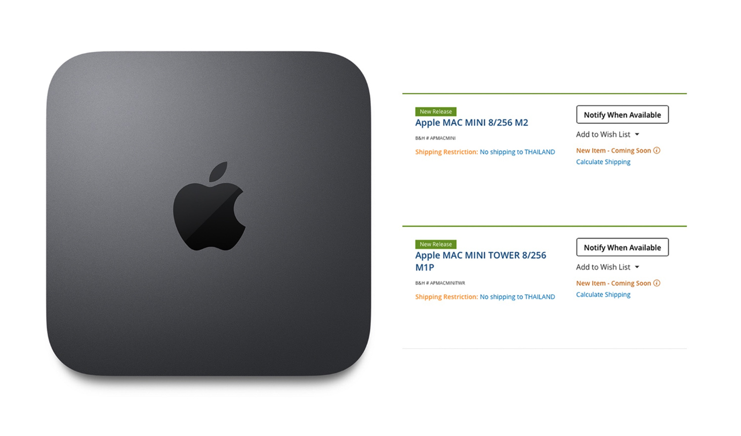 ก่อนจะถึงงาน WWDC22 เพียง 1 วัน ก็ได้มีการพบข้อมูลที่เว็บ B&H Photo ซึ่งเป็นตัวแทนจำหน่ายของ Apple โดยมีการเพิ่มข้อมูล Mac mini รุ่นใหม่ 2 รุ่นพร้อมระบุว่า Comming Soon มีชื่อรุ่นว่า Mac mini M2 และ Mac mini Tower M1P ไม่มีรายละเอียดสเปคระบุในเว็บ