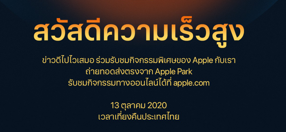 Apple Event เดือน ต.ค. 2020 นี้ใช้ชื่อธีมงานว่า “Hi, Speed” ซึ่งแปลเป็นไทยว่า สวัสดีความเร็วสูง ซึ่งความเร็วสูงในที่นี้อาจสื่อได้หลายประเด็น