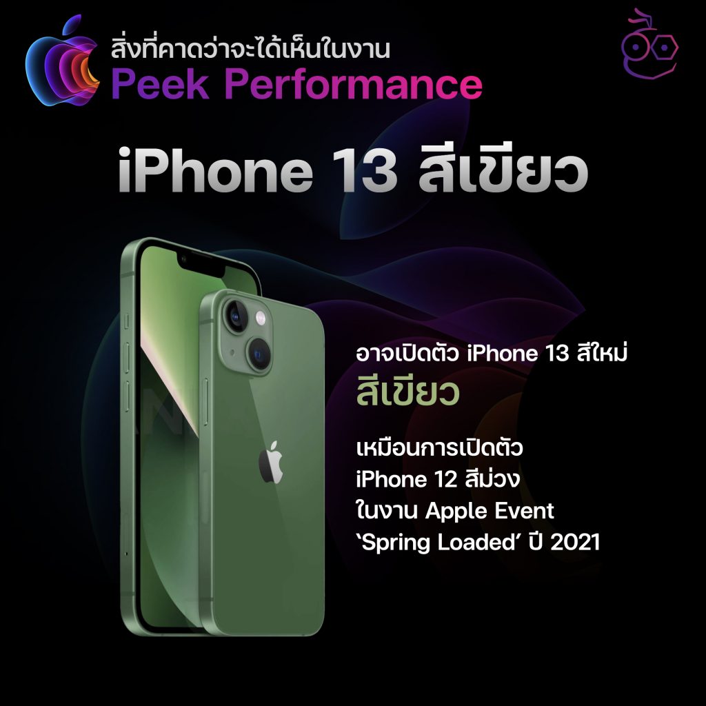ข่าวลือโค้งสุดท้ายระบุว่า Apple อาจเปิดตัว iPhone 13 สีใหม่ “สีเขียว” ในงานนี้ด้วย คล้ายกับการเปิดตัว iPhone 12 สีม่วง ในงาน Apple Event ‘Spring Loaded’ ปี 2021 ที่ผ่านมา