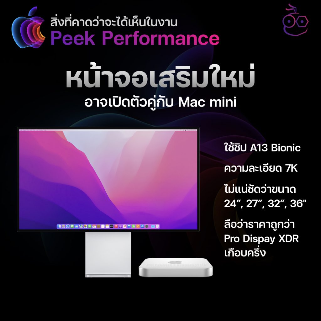 Apple อาจเปิดตัวหน้าจอเสริมตัวใหม่พร้อมกับ Mac mini รุ่นสเปคสูง ชิป M1 Pro, M1 Max ในงาน Event “Peek performance” นี้ ข่าวลือระบุว่าหน้าจอเสริมตัวใหม่มาพร้อมชิป A13 Bionic ความละเอียด 7K แต่ไม่มีข้อมูลว่าจะเป็นจอขนาด 24″ 27″ 32″ หรือ 36″
