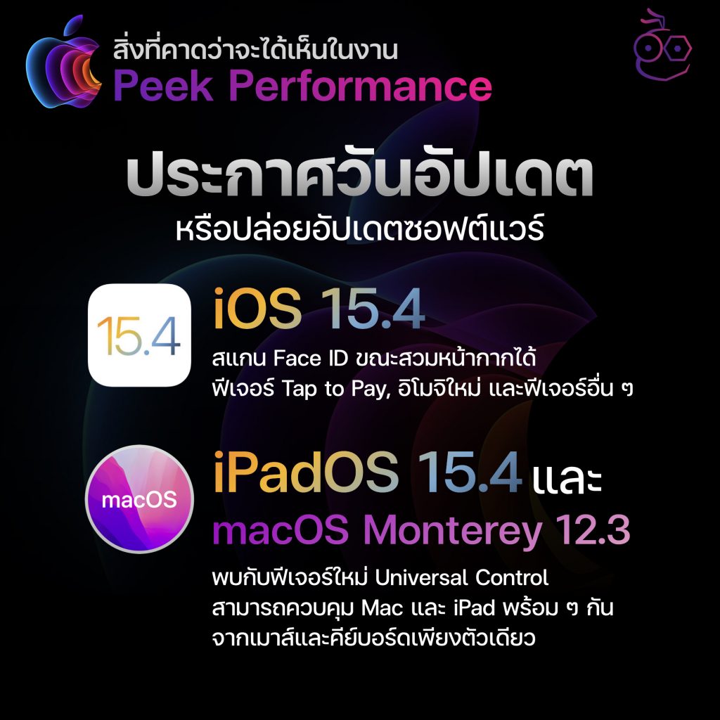 Apple ได้ปล่อยอัปเดตซอฟต์แวร์ iOS 15.4, iPadOS 15.4 และ macOS Monterey รุ่น Beta มาให้นักพัฒนาและผู้ใช้ทั่วไปได้ทดสอบกันมาหลายเวอร์ชันแล้ว คาดว่าในงานอีเวนท์ Apple อาจจะประกาศวันปล่อยอัปเดตซอฟต์แวร์ให้ทุกคนได้ทราบหรืออาจจะปล่อยอัปเดตซอฟต์แวร์เวอร์ชันทางการเลยก็ได้