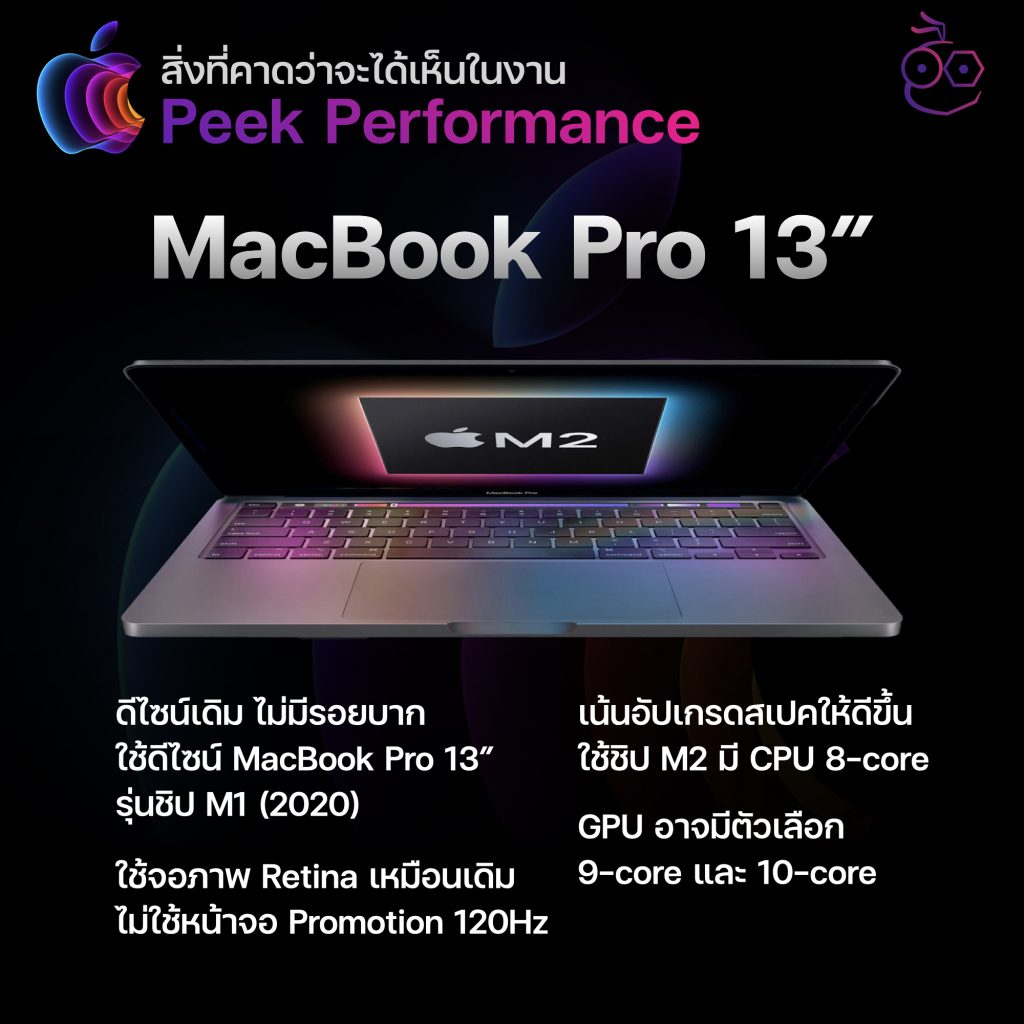 สำหรับ MacBook ก็มีข่าวลือมาให้ได้ลุ้นกันนิดหน่อยว่า Apple อาจเปิดตัว MacBook Pro รุ่น 13 นิ้วรุ่นรีเฟรชจาก MacBook Pro 13 นิ้ว ชิป M1 (2020) คาดว่าจะใช้ชิปประมวลผล M2