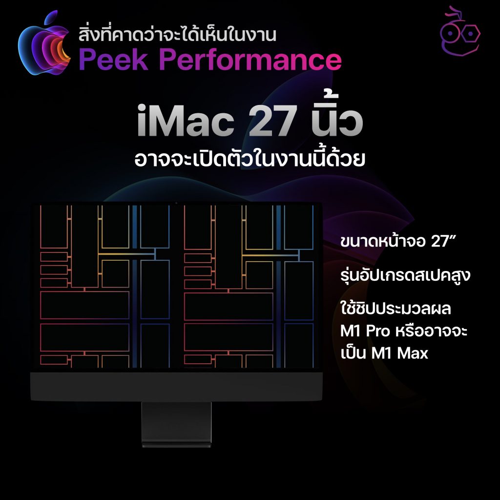 ไม่แน่ว่างานนี้เราอาจจะได้เห็น iMac 27 นื้วเปิดตัวในงานนี้ด้วย เป็นรุ่นอัปเกรดสเปค มีหน้าจอขนาด 27 นิ้วและใช้ชิปประมวลผล M1 Pro หรือ M1 Max