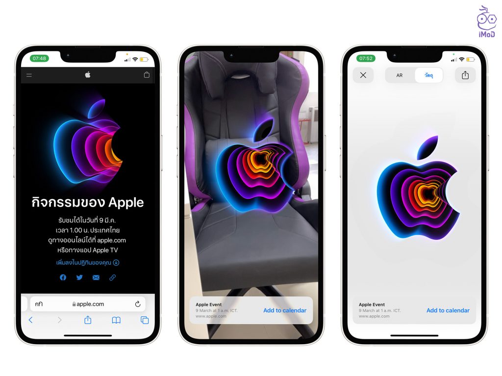 ในหน้าเว็บไซต์ Apple Event “Peek performance” เราสามารถเปิด [ลิงก์] ที่ Safari บน iPhone, iPad จากนั้นก็แตะที่โลโก้ แล้วยก iPhone, iPad เคลื่อนไหวไปรอบ ๆ เพื่อรับชมภาพภาพ AR หรือถ่ายภาพได้เลย