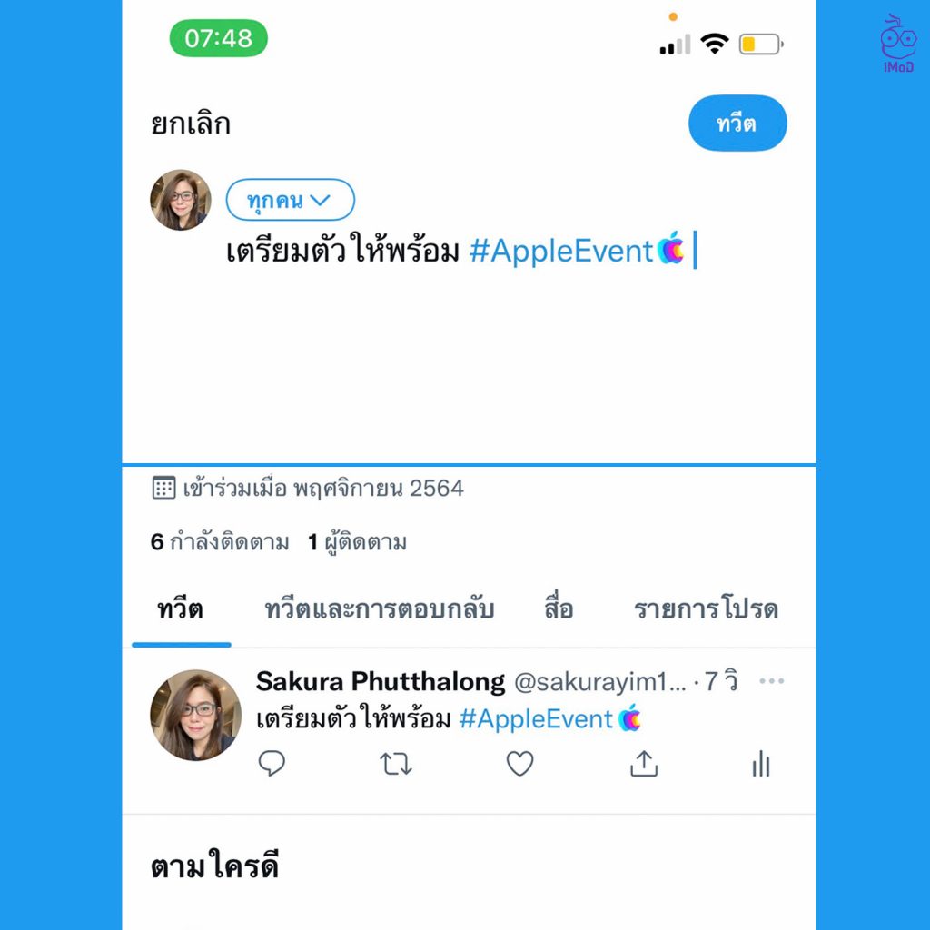 ส่วนทาง Twitter ก็ได้เพิ่มโลโก้ Event ‘Peek performance’ ด้วยเช่นกัน เพียงแค่พิมพ์แฮชแท็ก #AppleEvent โลโก้งานที่มีสีสันสดใสแสดงขึ้นมา โดยเริ่มตั้งแต่วันนี้จนถึง 11 มีนาคมนี้