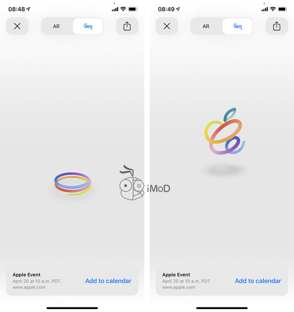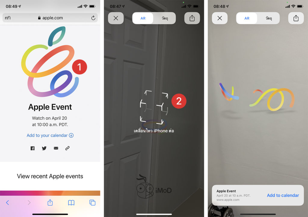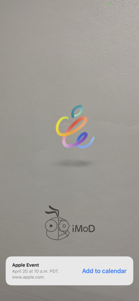 ในหน้าเว็บไซต์ Apple Event “Spring Loaded” ผู้ใช้สามารถเปิด [ลิงก์] ที่ Safari บน iPhone, iPad จากนั้นก็แตะที่โลโก้ แล้วเคลื่อนไหว iPhone, iPad ไปรอบ ๆ เพื่อรับชมภาพเคลื่อนไหวแบบ AR ได้เหมือนกับงานที่ผ่าน ๆ มา