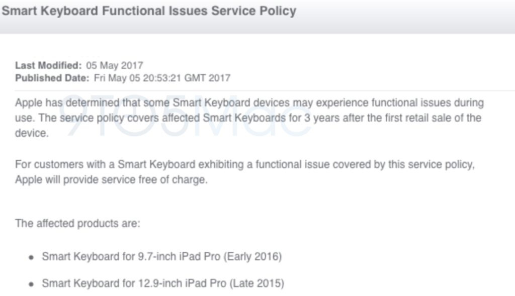 สำหรับปัญหารับซ่อมที่ Apple กล่าวถึงนั้นเป็นปัญหาของ Smart Keyboard รุ่น 9.7 นิ้ว (2016) และ 12.9 นิ้ว (2015) ที่ฟังก์ชันการทำงานบางอย่างมีปัญหา เช่น Smart Connector ไม่ทำงานหลังจากเชื่อมต่อกับ iPad Pro, เซนเซอร์มีปัญหา, ปัญหาตัวแม่เหล็ก (เดี๋ยวติดเดี๋ยวหลุด) และเชื่อมต่อแล้วไม่มีการตอบสนอง เป็นต้น