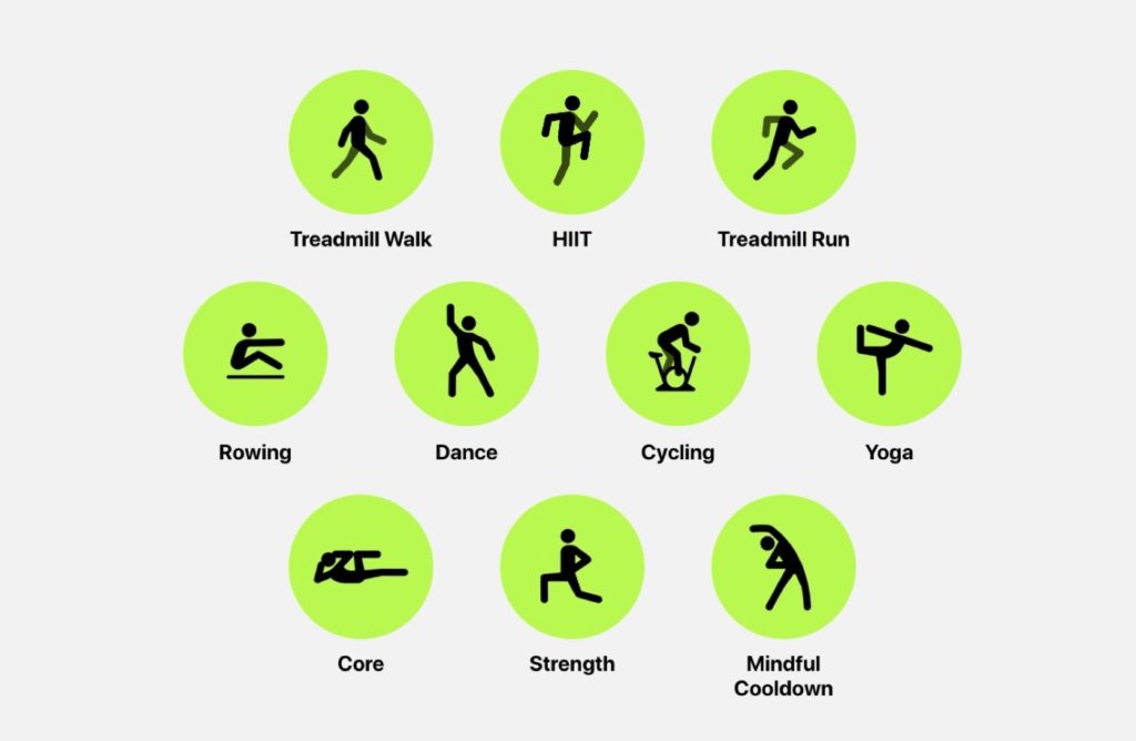 ประเภทการออกกำลังกายทั้ง 10 ประเภท ได้แก่ การออกกำลังแบบเข้มข้นสลับช้าเร็ว (HIIT), การออกกำลังกายแบบเน้นใช้งานกล้ามเนื้อ, โยคะ, เต้น, การออกกำลังกายแกนกลางลำตัว, การปั่นจักรยาน, วิ่งบนสายพาน (สำหรับวิ่งและเดิน) ออกกำลังกายด้วยเครื่อง Rowing และคูลดาวน์ ซึ่งนำโดยผู้ฝึกสอนพร้อมกับเพลงที่ช่วยสร้างแรงบันดาลใจในการออกกำลังกายให้กับผู้ใช้