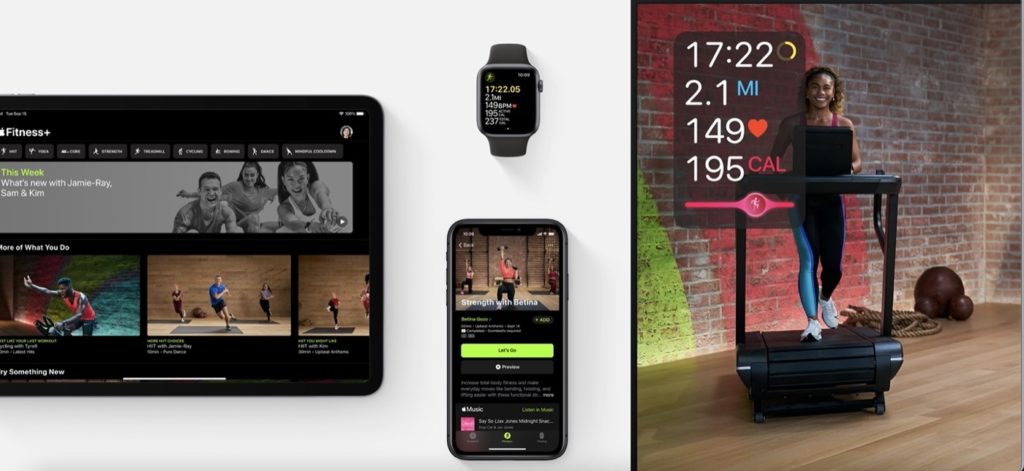 บริการ Apple Fitness+ เป็นบริการที่รวมการออกกำลังกายถึง 10 ประเภท โดยใช้ Apple Watch ร่วมกับการออกกำลังกาย รวมถึงใช้ iPhone, iPad และ Apple TV ช่วยให้การแสดงท่าทางการออกกำลังกายได้ สำหรับคนที่ไม่มี Apple Watch