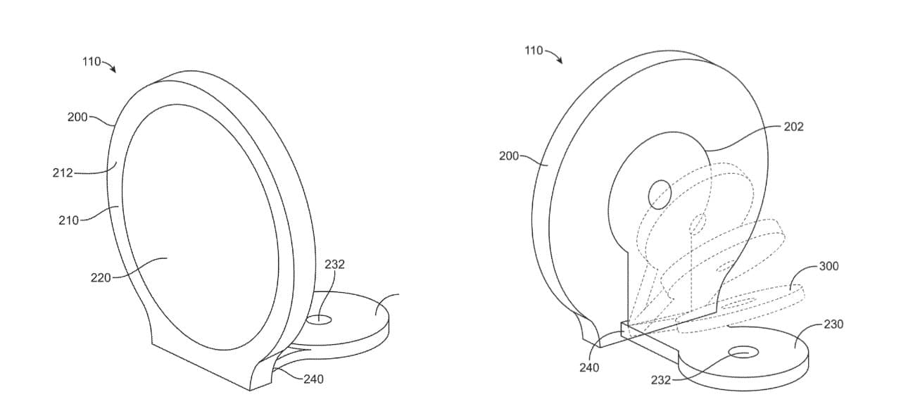 ดีไซน์ของขาตั้งกล้องในสิทธิบัตรตัวนี้คล้ายกับตลับแป้ง หรือกระจกแต่งหน้าที่พับและแยกออกมาเป็นขาตั้งกล้องได้ ส่วนที่ชาร์จก็สามารถพับราบและเปิดมุม 90 องศาได้