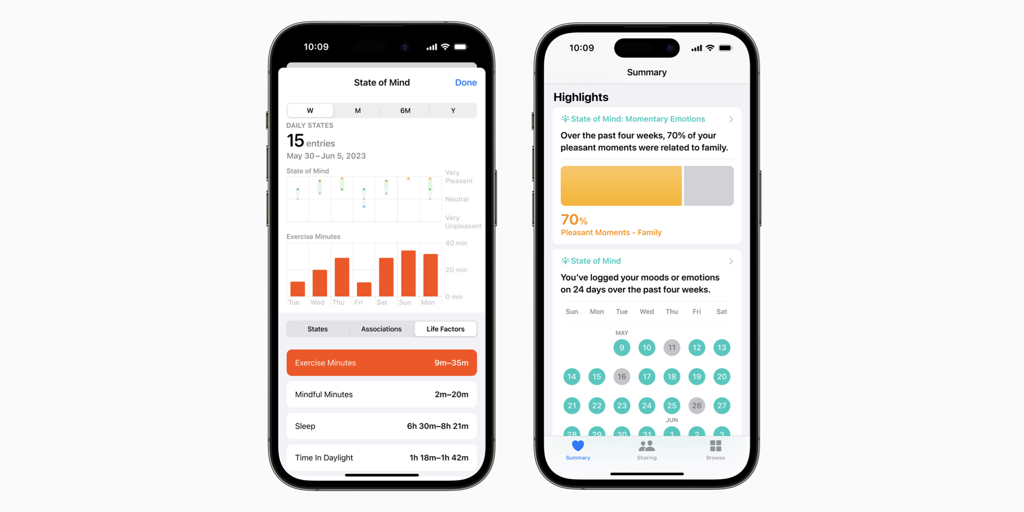 คุณสมบัติใหม่จะช่วยให้ผู้ใช้งานสามารถบันทึกความรู้สึกในชั่วขณะหนึ่งและอารมณ์ประจำวัน ดูข้อมูลเชิงลึกที่มีคุณค่า และเข้าถึงการประเมิน รวมทั้งแหล่งข้อมูลต่างๆ ได้อย่างง่ายดาย นอกจากนี้ iPhone, iPad และ Apple Watch ยังจะนำเสนอคุณสมบัติสุขภาพสายตาใหม่ ซึ่งจะช่วยสนับสนุนพฤติกรรมที่ดีต่อสุขภาพเพื่อช่วยลดความเสี่ยงของภาวะสายตาสั้น