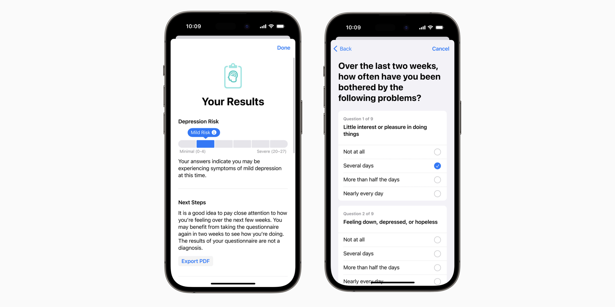 โดยในตอนนี้การประเมินความวิตกกังวลหรือภาวะซึมเศร้าแบบเดียวกับคลีนิก สามารถเข้าถึงได้อย่างง่ายดายในแอปสุขภาพและสามารถทำเมื่อใดก็ได้ การประเมินเหล่านี้สามารถช่วยผู้ใช้งานในการระบุระดับความเสี่ยงของตนเอง เชื่อมโยงกับแหล่งข้อมูลที่มีบริการในพื้นที่ และสร้างเอกสาร PDF เพื่อแชร์กับแพทย์ประจำตัว