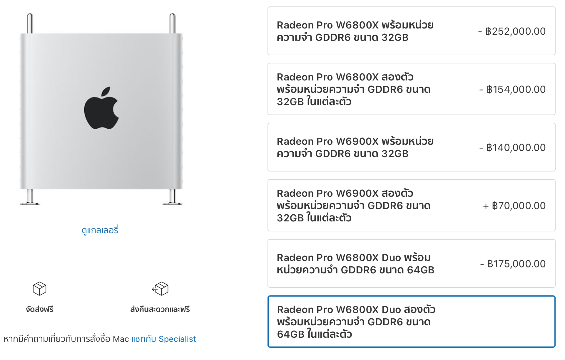 ในหน้าสั่งซื้อ Mac Pro ลูกค้าสามารถเลือกตัวเลือกการ์ดกราฟิกเพิ่มได้ ดังนี้