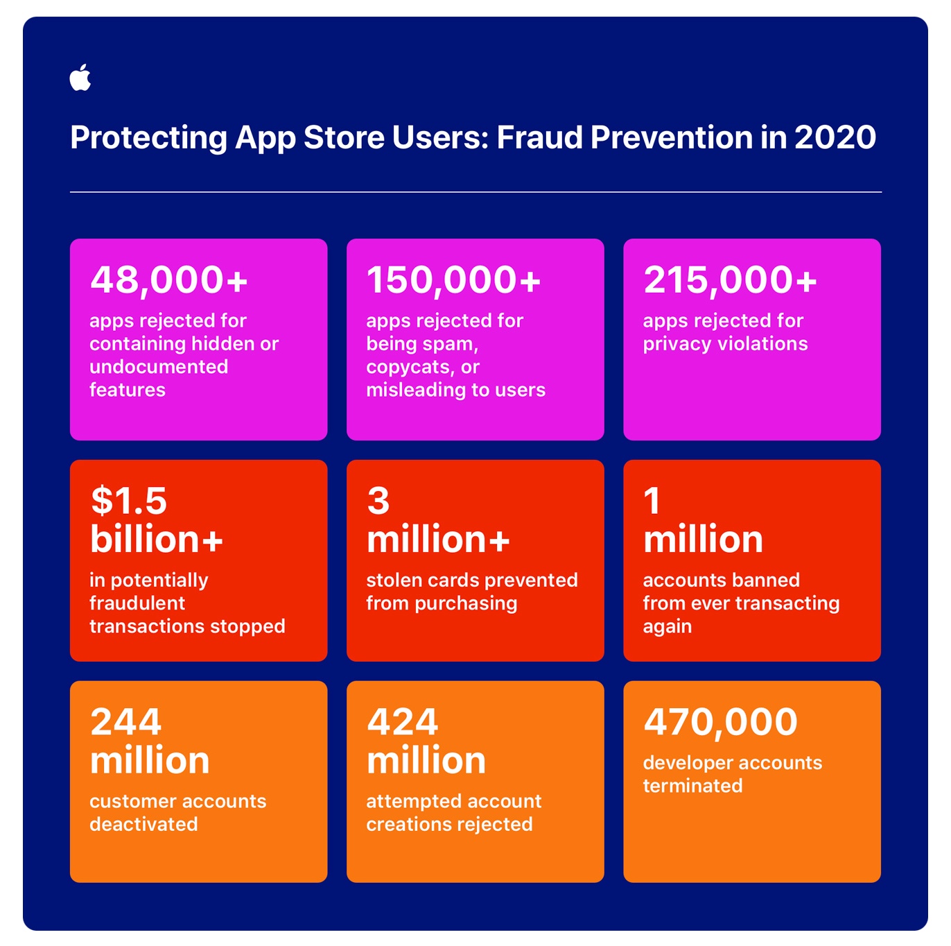 - ในปี 2020, Apple ได้ยกเลิกบัญชีนักพัฒนาไปแล้ว 470,000 บัญชี และปฏิเสธการสมัครเป็นนักพัฒนาอีก 205,000 ราย เพราะเคสการฉ้อโกง ป้องกันไม่ให้ผู้ฉ้อโกง นำส่งแอปเข้ามาใน App Store ได้อีก