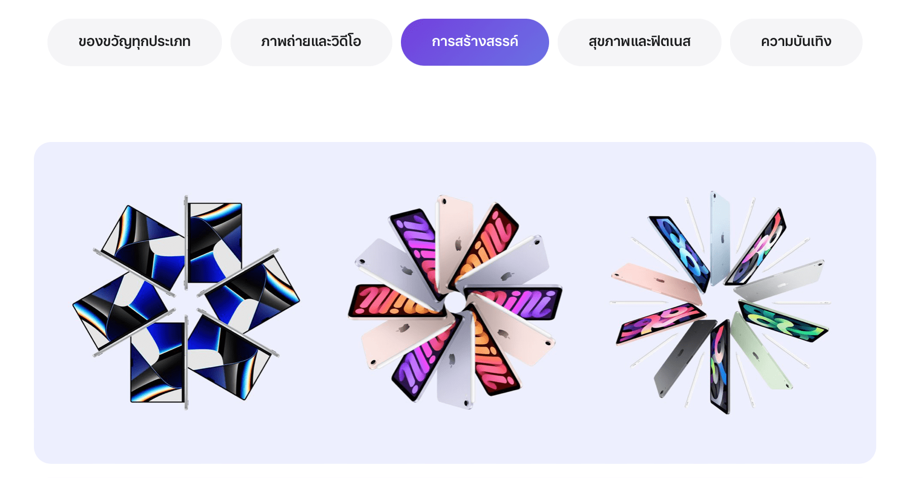 ปีนี้ Apple ก็มี “คู่มือของขวัญประจำเทศกาล” ที่เป็นคำแนะนำสำหรับสำหรับคนที่ไม่รู้จะซื้ออะไรเป็นของขวัญ เป็นแรงบันดาลใจเล็ก ๆ น้อย ๆ เพิ่มเติมจาก Apple ที่จะช่วยให้เราเลือกซื้อของขวัญได้ง่ายขึ้น โดยแบ่งหมวดหมู่ไปตามโอกาสในการใช้งาน ดังนี้