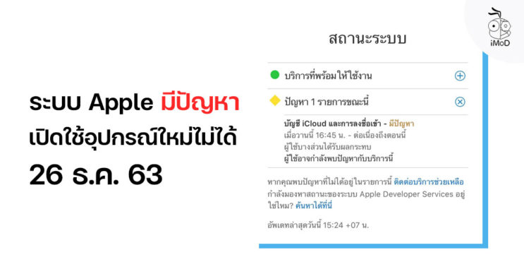 26 ธ.ค. 63, Apple รายงานที่หน้าเว็บสถานะระบบว่า ระบบบัญชี iCloud และการลงชื่อเข้าใช้มีปัญหา ส่งผลกระทบต่อผู้ใช้บางราย และมีรายงานว่าผู้ใช้บางรายเปิดใช้อุปกรณ์ใหม่ไม่ได้