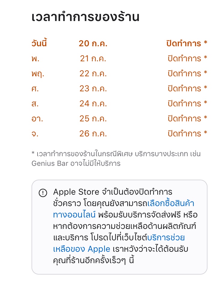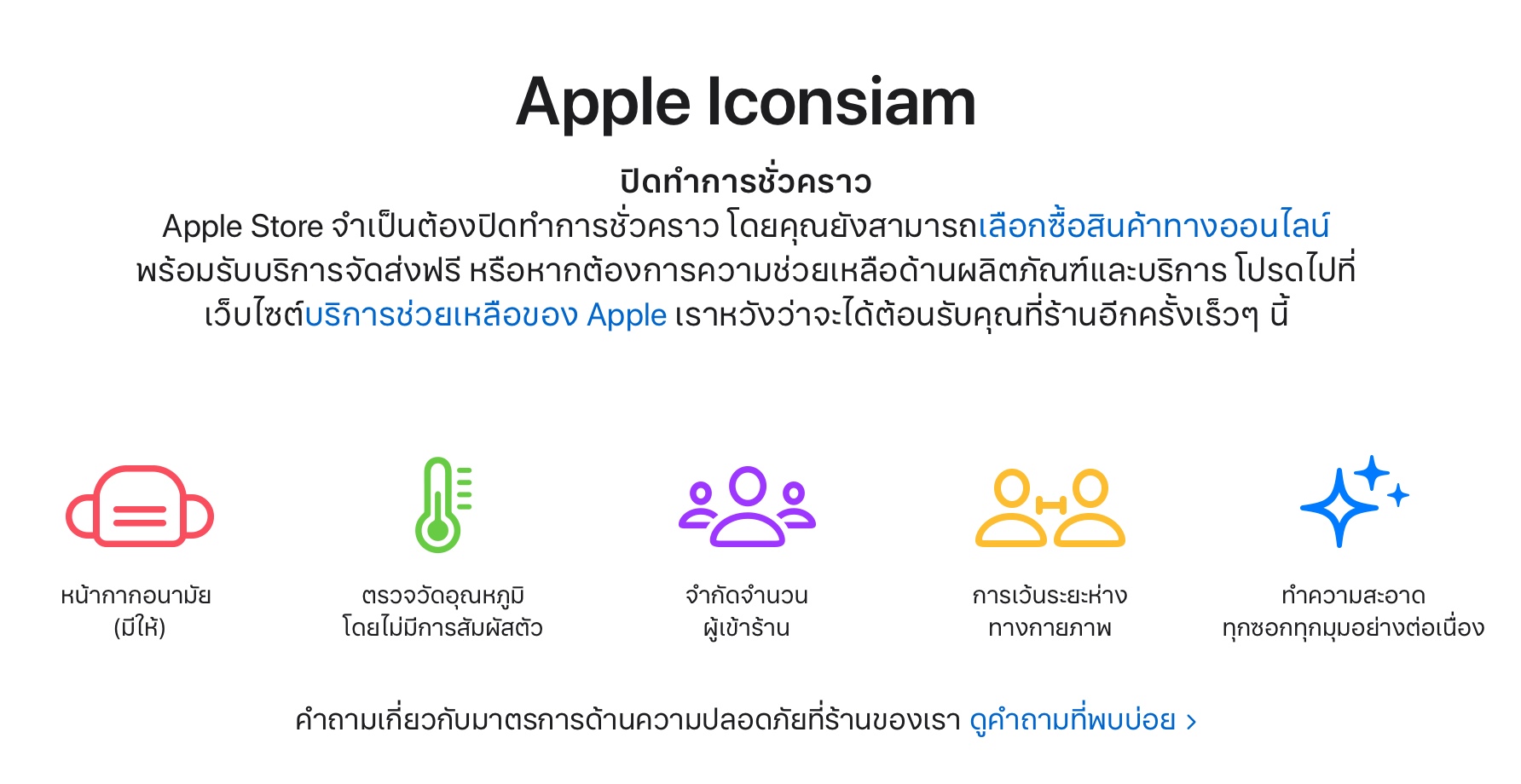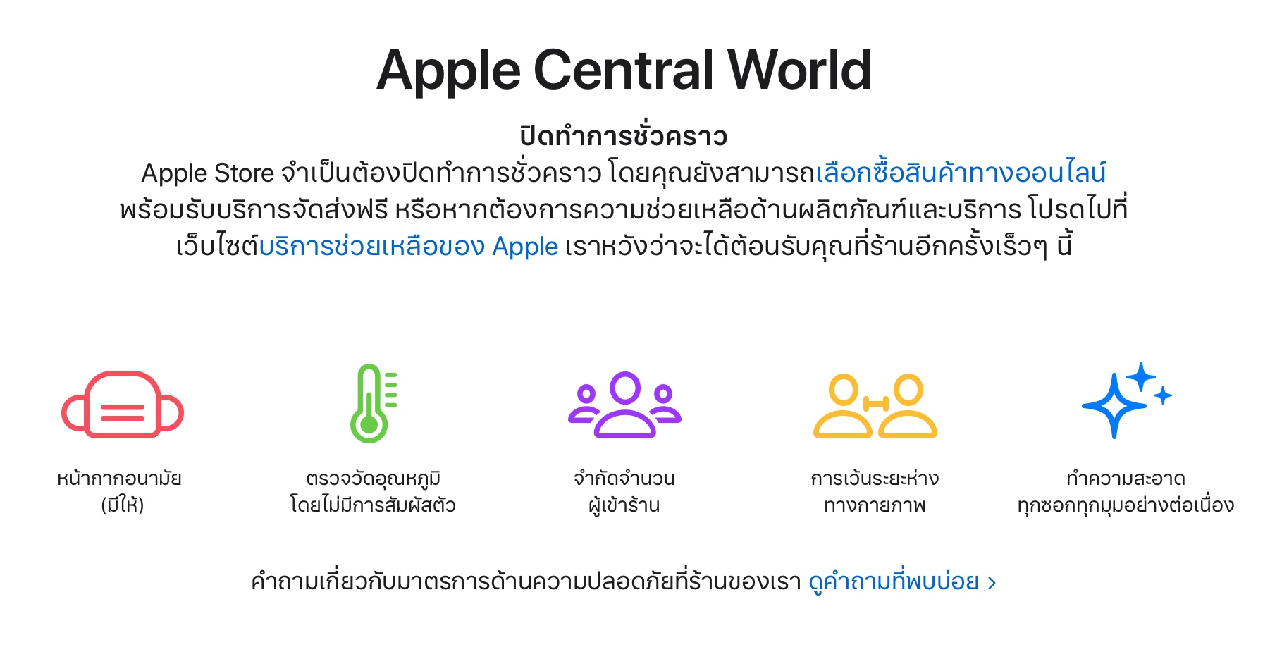 การปิดทำการชั่วคราว Apple Store ทั้ง 2 สาขาในประเทศไทย มีแนวทางปฏิบัติที่ผู้ติดต่อหรือลูกค้าควรทราบดังนี้