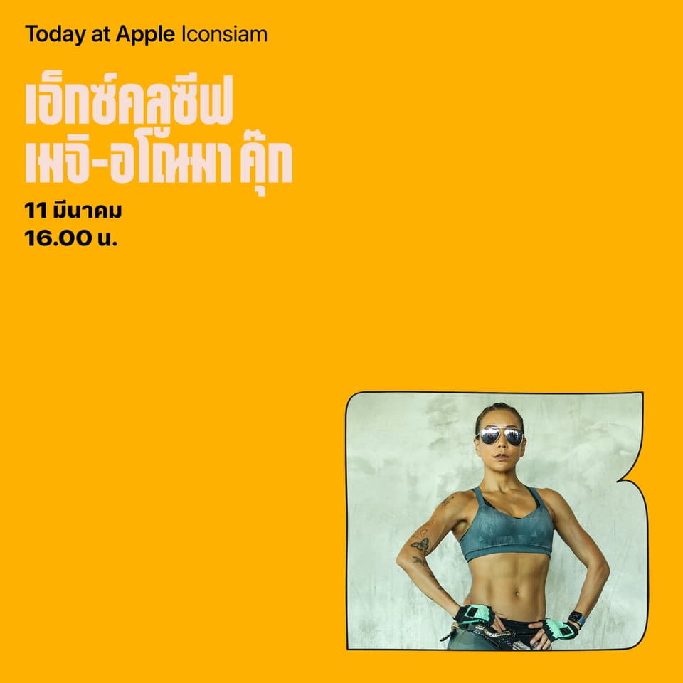 โดยคุณเมจิ-อโณมา คุ๊ก กูรูด้านสุขภาพและนักไตรกีฬา เจ้าของรางวัลการันตีความสำเร็จทั้งด้านกีฬาและการจุดประกายให้ผู้คนหันมาดูแลสุขภาพอย่างยั่งยืน จะมาแชร์หลากหลายเทคนิคดีๆ ในการสร้างสรรค์ไลฟ์สไตล์ที่เฮลตี้ พร้อมแบ่งปันคุณสมบัติสุดคูล ของ Apple Watch ที่จะช่วยให้ผู้ใช้ติดตามข้อมูลสุขภาพได้หลากหลายมิติเพื่อพิชิตเป้าหมายการมีสุขภาวะที่ดี